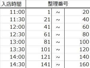 ご自身の整理番号をご確認の上、下記整理番号ごとの入店時間を確認の上ご来店ください。