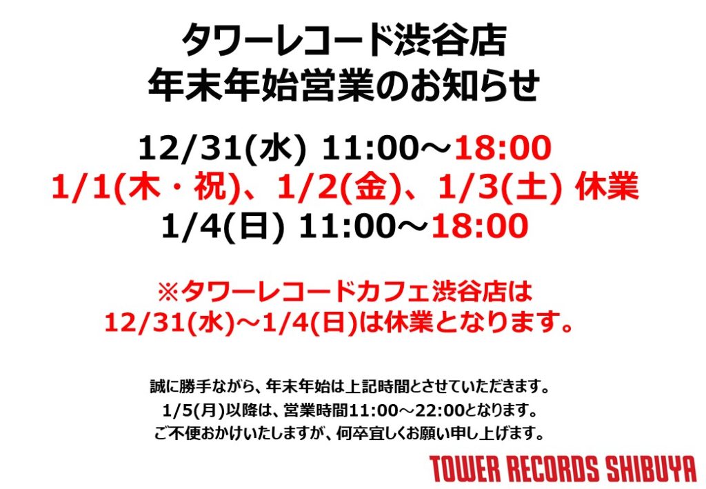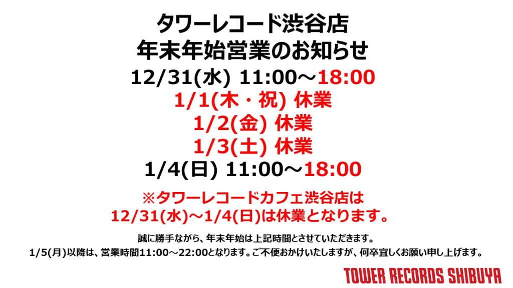※タワーレコードカフェ渋谷店は、2025年12月31日(水)~2026年1月4日(日)まで休業となります。
