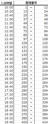ご自身の整理番号をご確認の上、下記整理番号ごとの入店時間を確認の上ご来店ください。